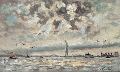 André Hambourg effectuera son premier voyage à New York en 1972, il était déjà en contact avec les Etats-Unis depuis 1963, date à laquelle la Galerie Wally Findlay de New York devient son marchand exclusif. Il retournera à New York en 1973, 1978, 1979, 1981, 1984, 1985. Comme de sa chambre de l’hôtel Gabrielli à Venise, il résidera à New York toujours dans le même hôtel, la même chambre sur Grand Army Plaza, à l’entrée de Central Park, c’est ce motif qu’il peindra le matin, le soir, sous la pluie, sous la neige, en hiver, en automne, au printemps, soit la réalisation d’une quarantaine de toiles. Comme pour les marchés marocains ou de Côte d’Ivoire ou encore de Provence, ce qui passionne l’artiste ce sont les expressions de la vie, les détails d’une toile importante de 1978, «Midi au printemps», l’animation des gens, les couleurs des parasols, un joueur de guitare, un landau de bébé … sur Grand Army Plaza sont à cet égard particulièrement significatifs. Il peindra la Statue de la Liberté (10 toiles en 1973), 3 toiles de la Statue depuis Battery Park et 4 autres à l’ombre ou sous la Statue également en 1973. Les ponts de New York l’inspirent aussi (6 toiles), dans l’ensemble de ses œuvres new-yorkaises, comme en Normandie, à Venise ou Abidjan, l’artiste est sensible à une clarté humide de l’air qu’il sait rendre avec maestria.