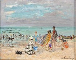 "La plage de Trouville" huile sur toile signée en bas à gauche - 55 x 65 cm