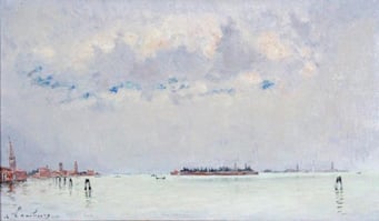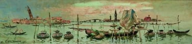 " Venise la Lagune vers Murano" 1961 Huile sur toile 27 x 46 cm